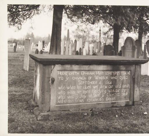 Ephraim Huit: Historical information courtesy of The Windsor Histor ical Society, and in particular Christine Ermenc, Executive Director; and the Abigail Wolcott Ellsworth Chapter of the DAR which copied all the cemetery inscriptions here in 1929; and to Barbara Sanborn who donated a notebook of with birth and death dates noted on gravestone s from 1894-2013.